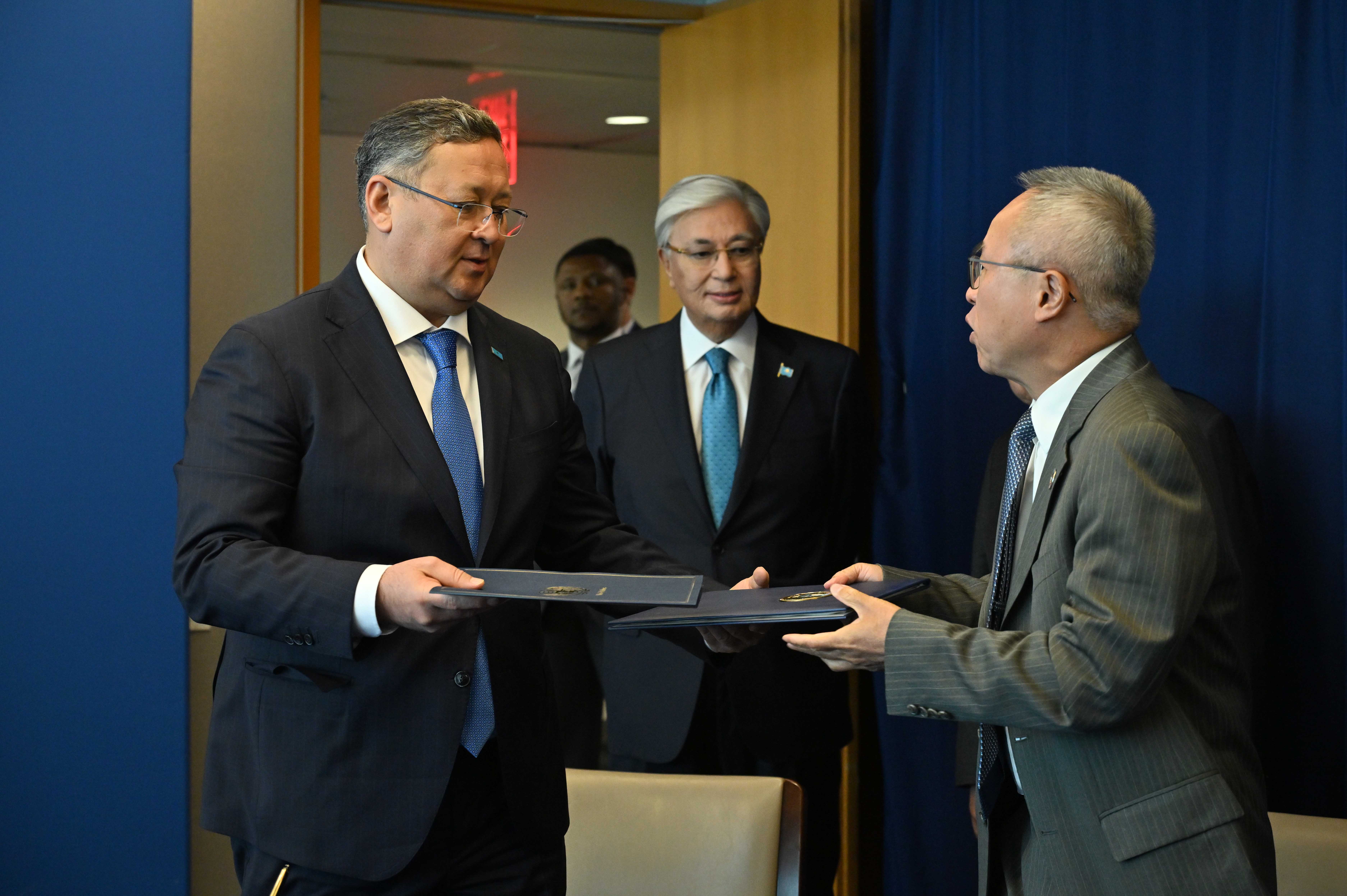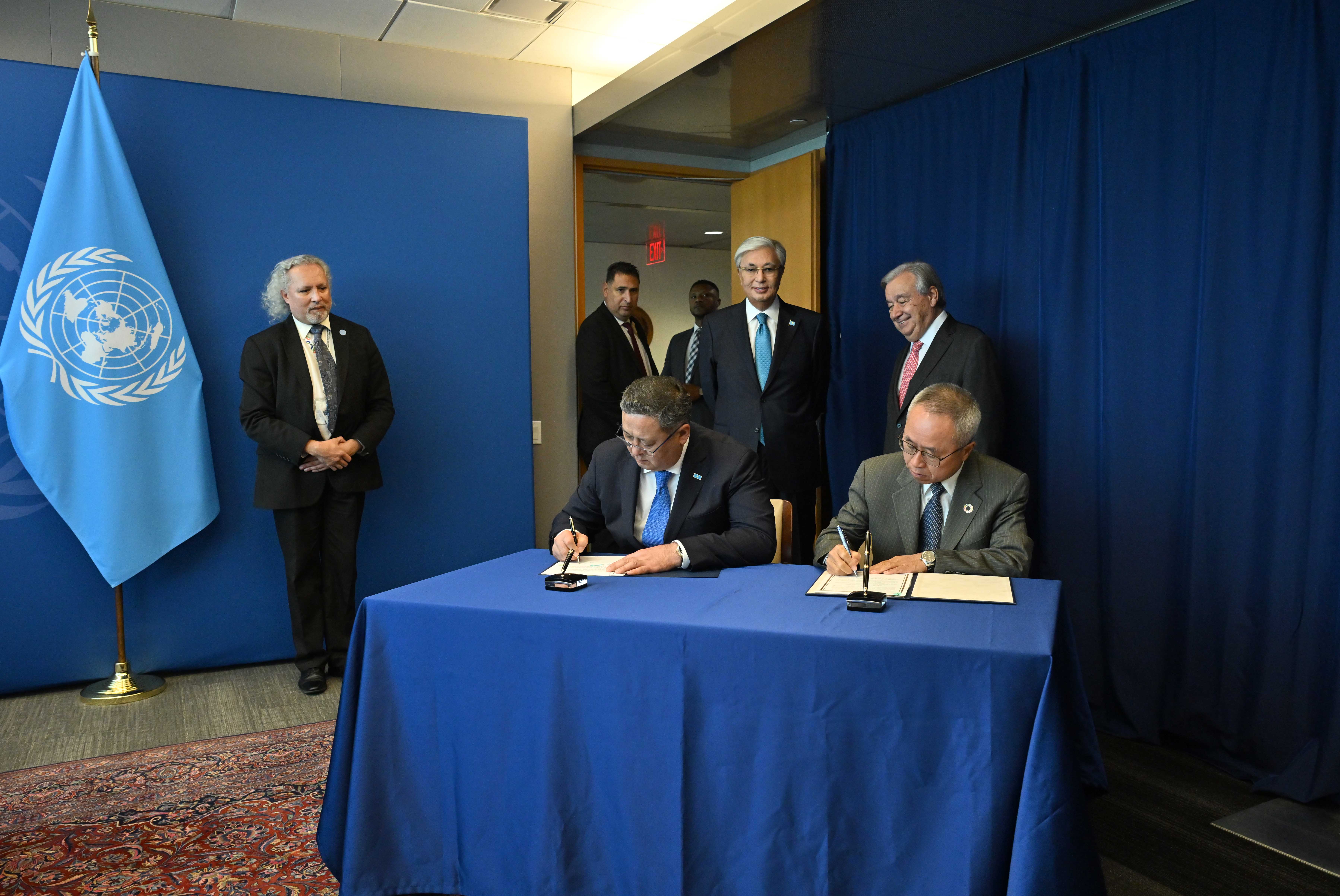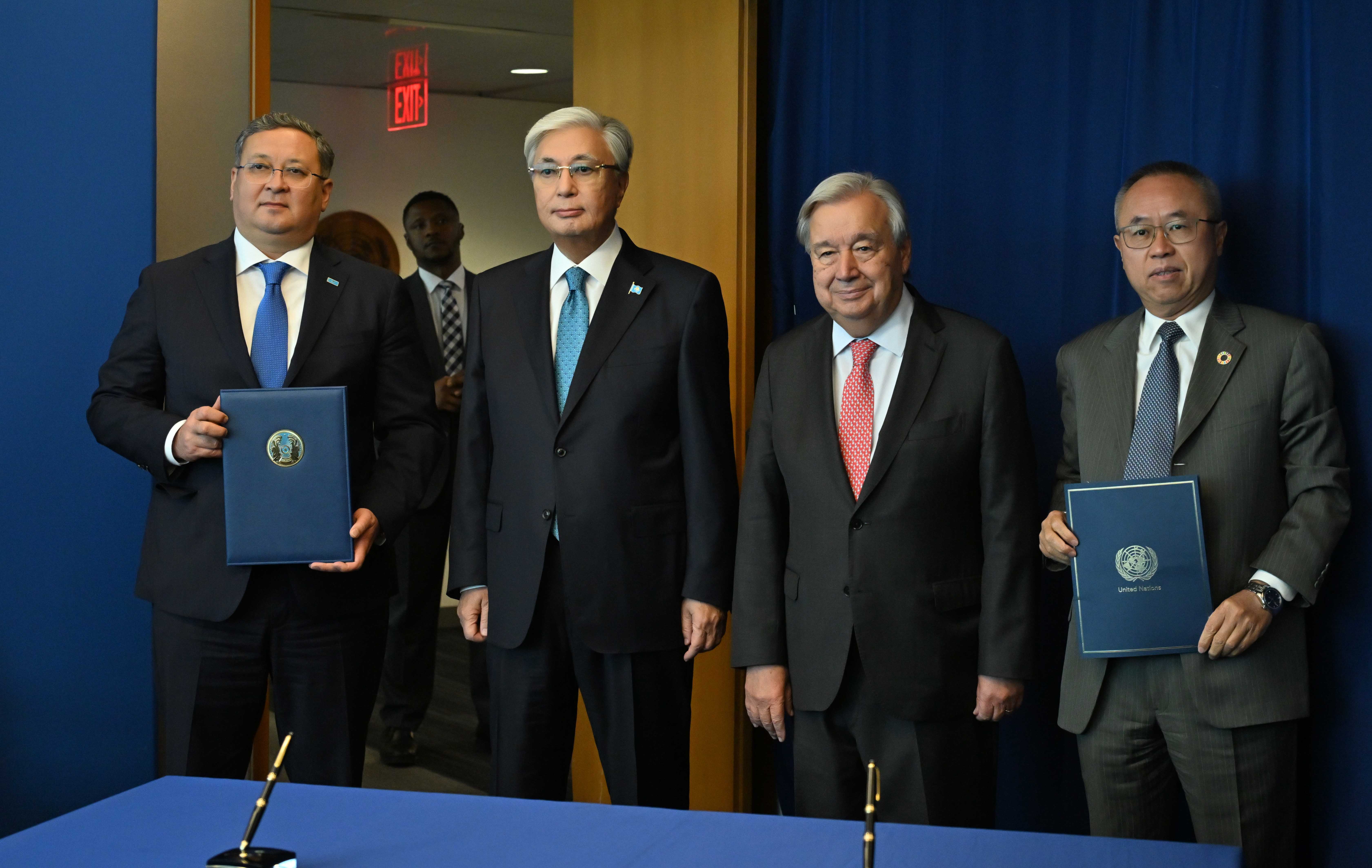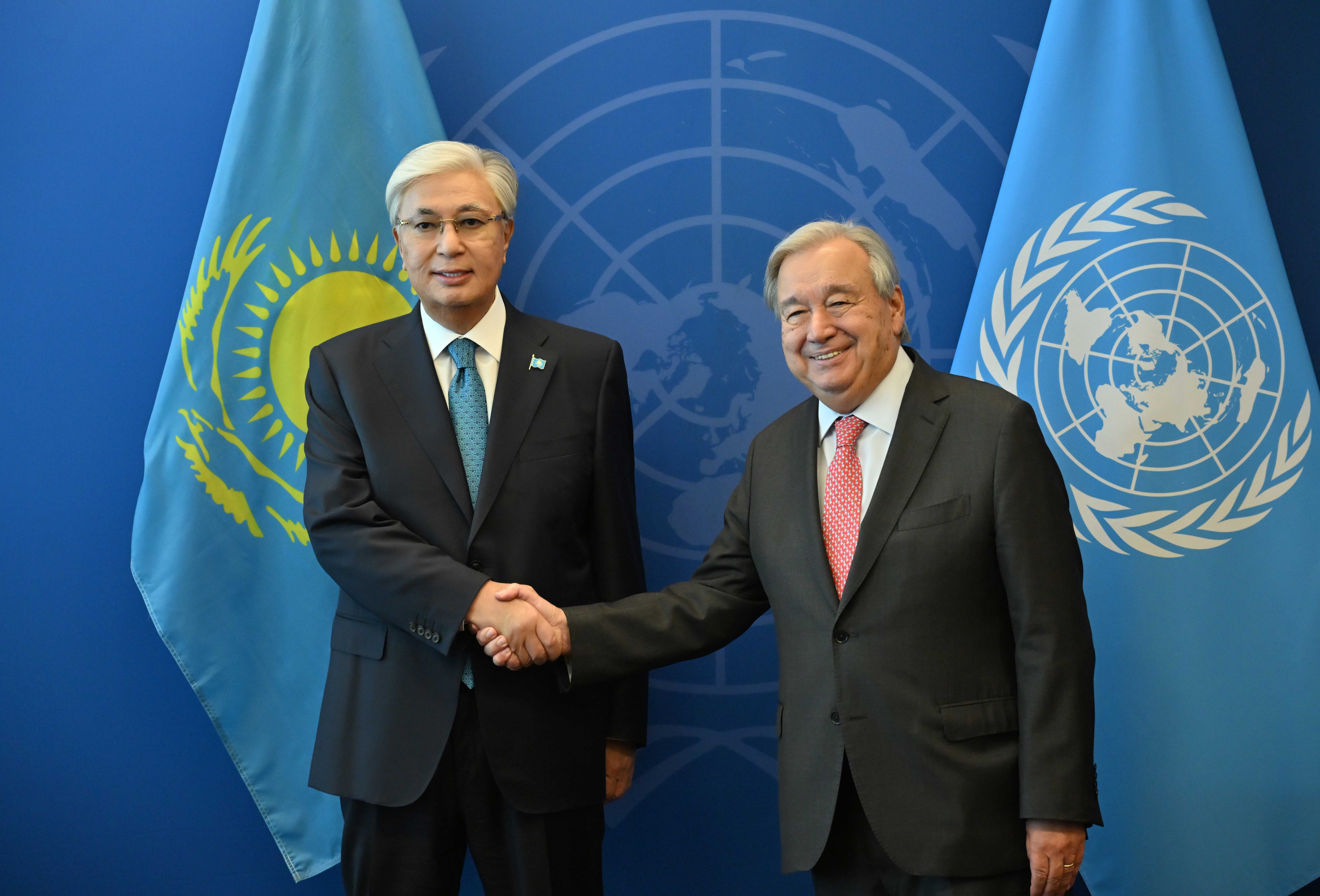 АҚШ, Нью-Йорк қаласы Қазақстан Президенті мен Бас хатшы Антониу Гутерриш БҰҰ Бас Ассамблеясы сессиясының күн тәртібін талқылады. Қасым-Жомарт Тоқаев Қазақстан Ұйымға алдағы уақытта да қолдау көрсетіп, оның бейбітшілік пен тұрақтылықты нығайту, орнықты даму ісінде жетекші рөл атқара беруіне белсенді түрде атсалысатынын айтты. Кездесу аясында Мемлекет басшысының және Бас хатшының қатысуымен Алматыдағы Орталық Азия мен Ауғанстан үшін БҰҰ-ның Орнықты даму мақсаттары жөніндегі Өңірлік орталығының қызметі туралы меморандумға қол қойылды.