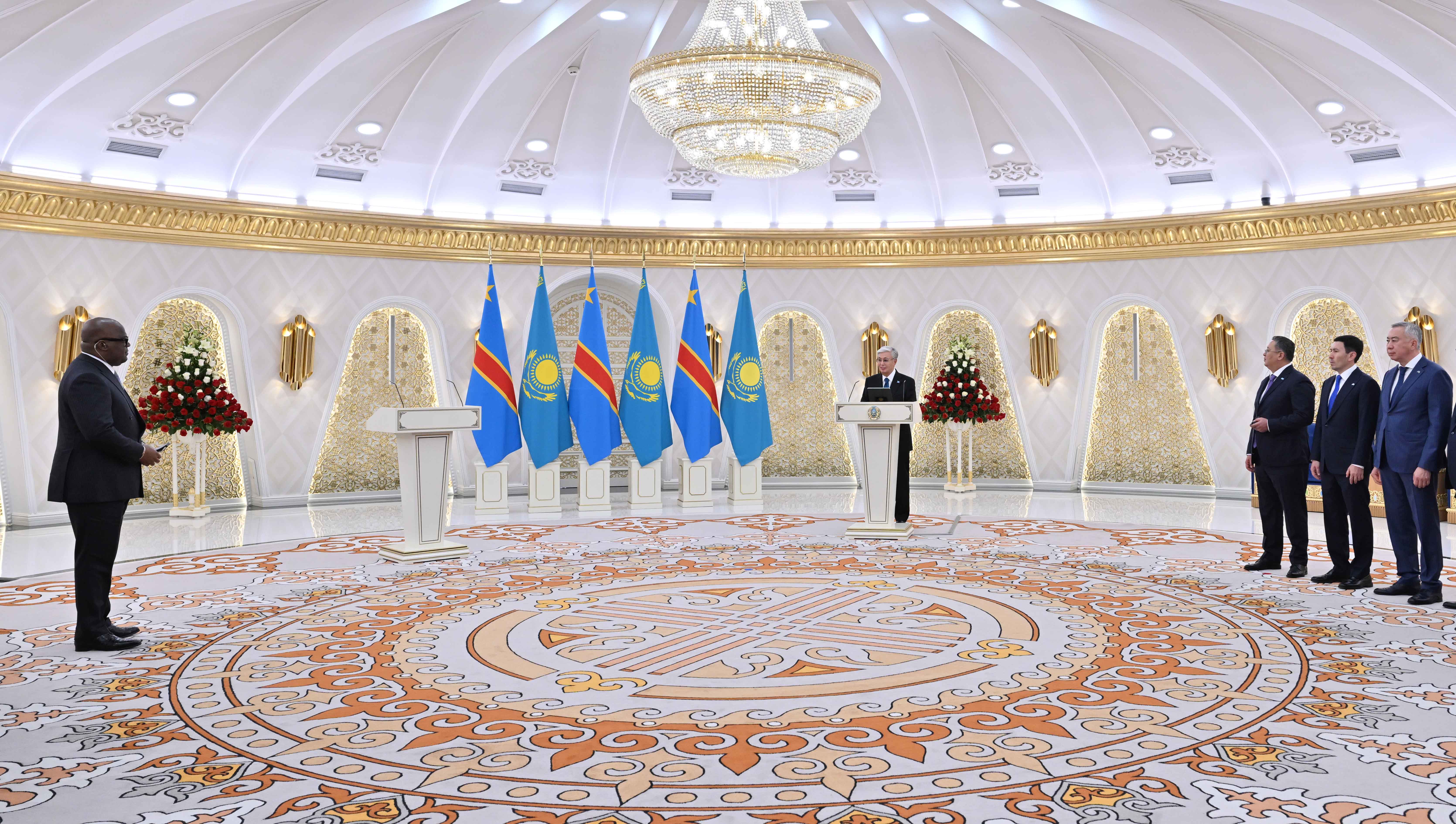– Қазақстан Республикасы мен Конго Демократиялық Республикасы арасындағы қарым-қатынастар тың қарқын алуда. Ең алдымен, Президент Феликс Чисекеди мырзаны Қазақстанда алғашқы мемлекеттік сапармен қарсы алу – біз үшін үлкен құрмет. Конго Демократиялық Республикасы – Қазақстанның Африка құрлығындағы маңызды әрі сенімді серіктесі. Екі ел арасындағы байланыстар берік достық пен өзара құрметке негізделген. Қазақстан Конго Демократиялық Республикасымен түрлі саладағы ынтымақтастықты нығайтуға мүдделі. Ықпалдастықты ерекше серпінмен тереңдету үшін барлық мүмкіндік бар. Жоғары деңгейдегі саяси ниетіміз – ортақ, сауда-экономикалық әлеуетіміз – мол, мәдени-гуманитарлық саладағы мақсат-міндеттеріміз бір. Бүгінгі келіссөз қорытындылары – осының айқын дәлелі. Біз өзара қолдау мен түсіністік рухында екіжақты қатынастарды жаңа деңгейге көтеруге уағдаластық. Екі елдің мүддесіне сай келетін маңызды келісімдерге қол жеткіздік. Халықаралық сахнадағы ықпалдастықты одан әрі нығайтуға келістік. Жаһандық қауіпсіздік және тұрақтылықты қамтамасыз ету ісінде күш-жігерімізді жұмылдыруға ниет білдірдік. Жалпы, Астана мен Киншаса арасындағы сан қырлы серіктестіктің әлеуеті мол, болашағы зор деп айтуға толық негіз бар, – деді Мемлекет басшысы.