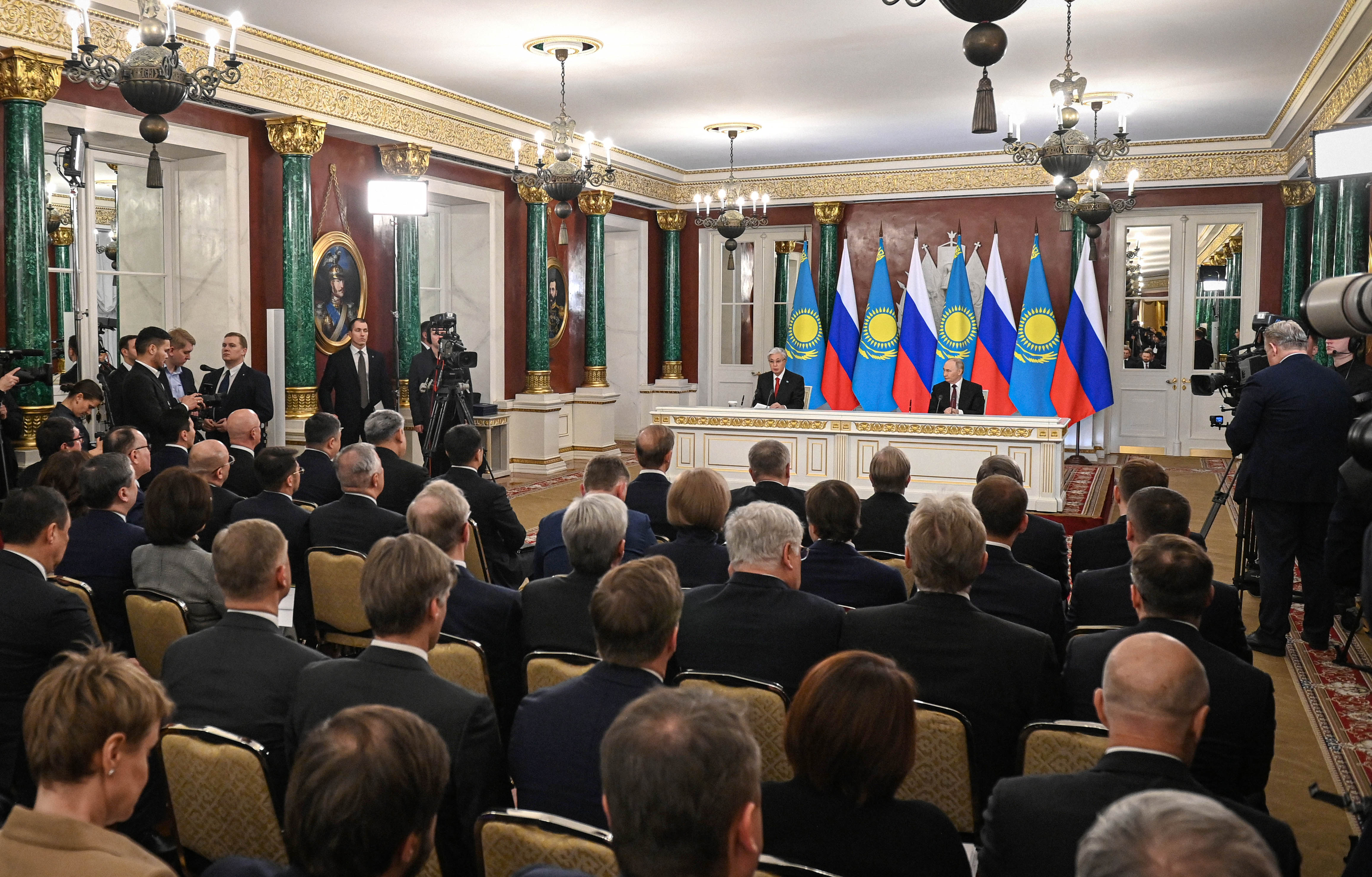 Қасым-Жомарт Тоқаев пен Владимир Путин бұқаралық ақпарат құралдары өкілдерінің алдында бірлескен мәлімдеме жасады.