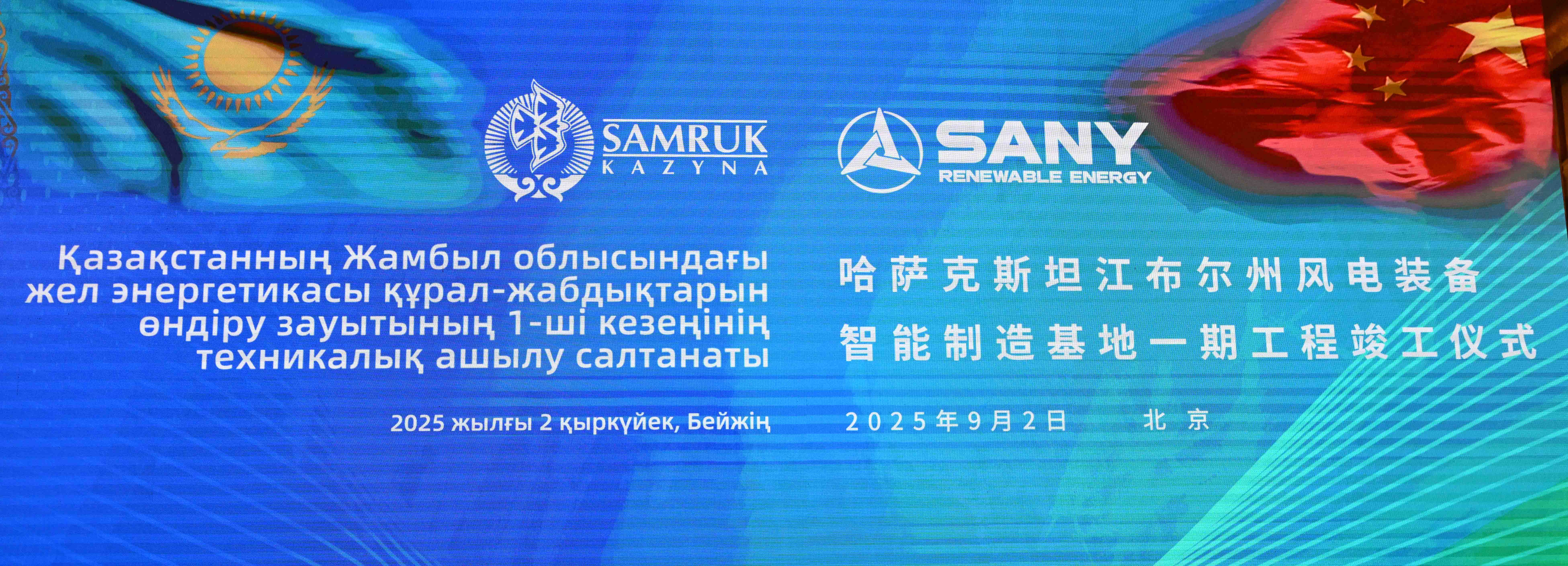 ҚХР, Бейжің қаласы Қасым-Жомарт Тоқаев Қытайдағы ресми сапары аясында ҚХР Мемлекеттік кеңесінің бірінші вице-премьері Дин Сюэсянмен бірге бейнебайланыс арқылы Жамбыл облысында жел генераторларына арналған қосалқы бөлшектер шығаратын зауыттың алғашқы кешенін салтанатты түрде іске қосты. Аталған жоба – «Самұрық-Қазына» ұлттық әл-ауқат қоры мен SANY Renewable Energy компаниясының табысты серіктестігінің нәтижесі. Бұл жел энергетикасына арналған қондырғылар шығаратын әлемдегі ең ірі компанияның елімізде ашқан бірінші кәсіпорны. Өндірістік база Шу қаласындағы «Жібек жолы» арнайы экономикалық аймағында орналасқан. Кәсіпорын гондола, күпшек, мұнара сияқты жел электр стансасына қажет бөлшектерді шығарады. Жобаны жүзеге асыру еліміздегі жаңа электр стансаларының құрылысын қамтамасыз етіп, «жасыл» энергетиканың дамуына зор үлес қосады.