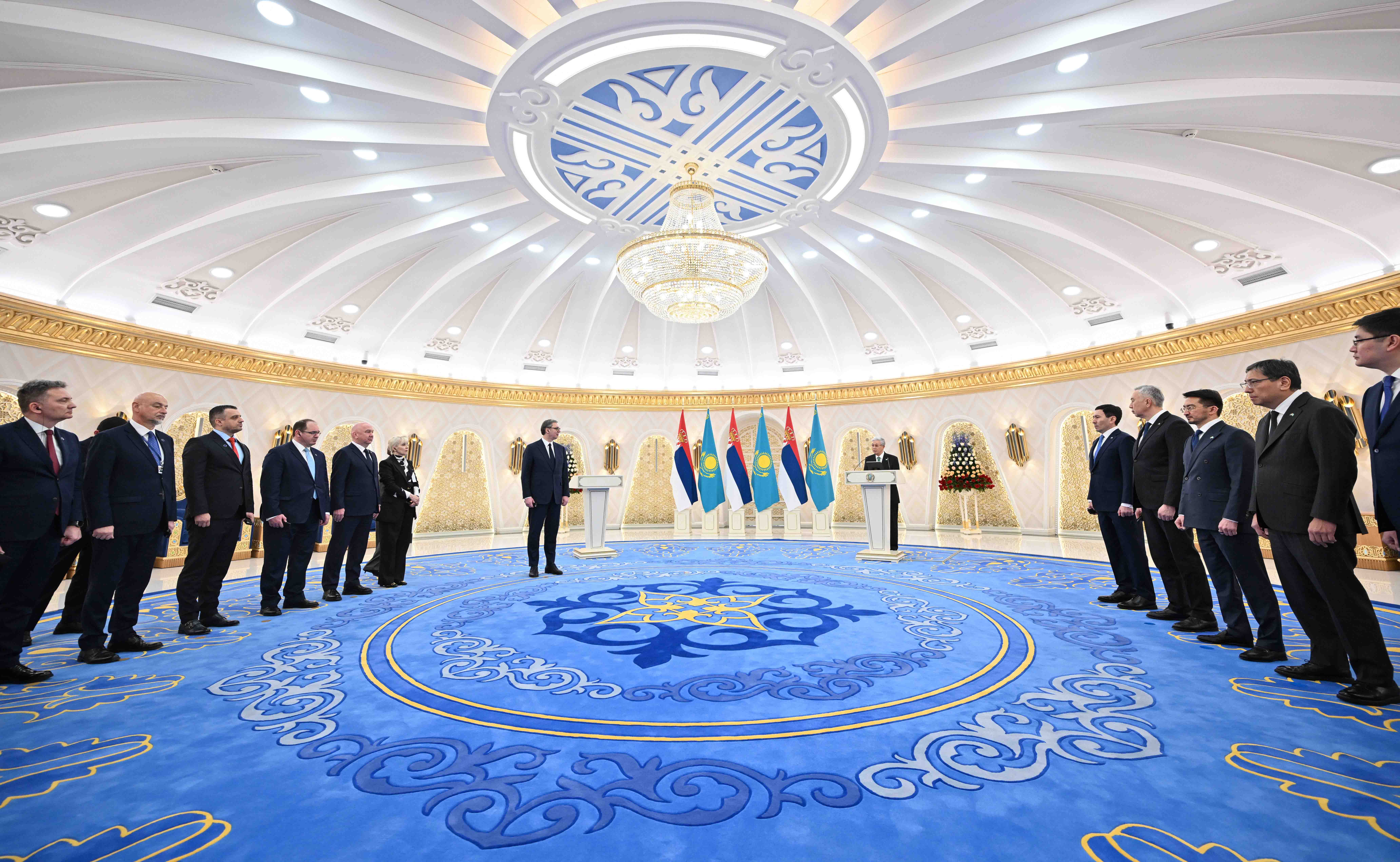 Қасым-Жомарт Тоқаев Александр Вучичті халық қолдауына арқа сүйеп, елін алға бастап келе жатқан нағыз көшбасшы, беделді саясаткер деп санайтынын жеткізді. – Сербия Сіз жүргізіп отырған салиқалы саясаттың арқасында зор жетістіктерге жетіп, өркендеп келеді. Халықаралық беделі де арта түсті. Алдағы уақытта еліңіз Сіздің парасатты басшылығыңызбен жаңа белестерді бағындыра береді деп сенемін. Сербия – Қазақстанның Балқан түбегіндегі сенімді серіктесі. Екі елдің қарым-қатынасы өзара қолдауға, түсіністік пен мызғымас достыққа негізделген. Барлық деңгейде белсенді саяси диалог дамып келе жатыр. Сауда-экономика, инвестиция және мәдени-гуманитарлық саладағы ынтымақтастық нығайып келеді. Көпжақты құрылымдар аясындағы байланысымыз күшейе түсті. Қазіргідей алмағайып кезеңде өзара әріптестікті жандандыру өте маңызды. Сондықтан біз осы қарқынды сақтап, түрлі саладағы ықпалдастықты дамытуға мүдделіміз. Бұған толық мүмкіндік бар. Өзара сенім мен достық рухында өткен мазмұнды келіссөздер – соның айқын дәлелі. Бүгінгі келісімдер серіктестігімізді жаңа деңгейге көтереді деп санаймын. Біз бұл бағытта бірлесіп әрекет етуге әрдайым дайынбыз, – деді Президент. Қасым-Жомарт Тоқаев Қазақстан мен Сербия арасындағы байланысты нығайтуға өлшеусіз үлес қосқаны үшін Александр Вучичті еліміздің ең жоғары мемлекеттік наградасы – «Алтын Қыран» орденімен марапаттады. – Бұл – қазақ жұртының Сізге және Сербия халқына деген зор ризашылығы және ерекше құрметінің белгісі. Өзіңізді шын жүректен құттықтаймын! Осы марапат екі елдің қарым-қатынасын одан әрі дамытуға ықпал етеріне кәміл сенемін. Қос халықтың достығы жасай берсін! – деді Мемлекет басшысы. Сербия Президенті мұндай марапатты иелену зор мәртебе екенін айтып, бұл екі ел арасындағы қарым-қатынасты одан әрі нығайтуға ықпал ететініне тоқталды. – «Алтын Қыран» орденін ерекше құрметпен қабыл алдым. Бұл марапат маған өзара байланыстарымызды арттыру және бейбітшілік пен тұрақтылықты қамтамасыз ету жолындағы ортақ істе зор жауапкершілік жүктейді. Келешек ұрпақтың игілігі үшін Сербия мен Қазақстанның достығы нығая беруіне тілектеспін, – деді Александр Вучич.