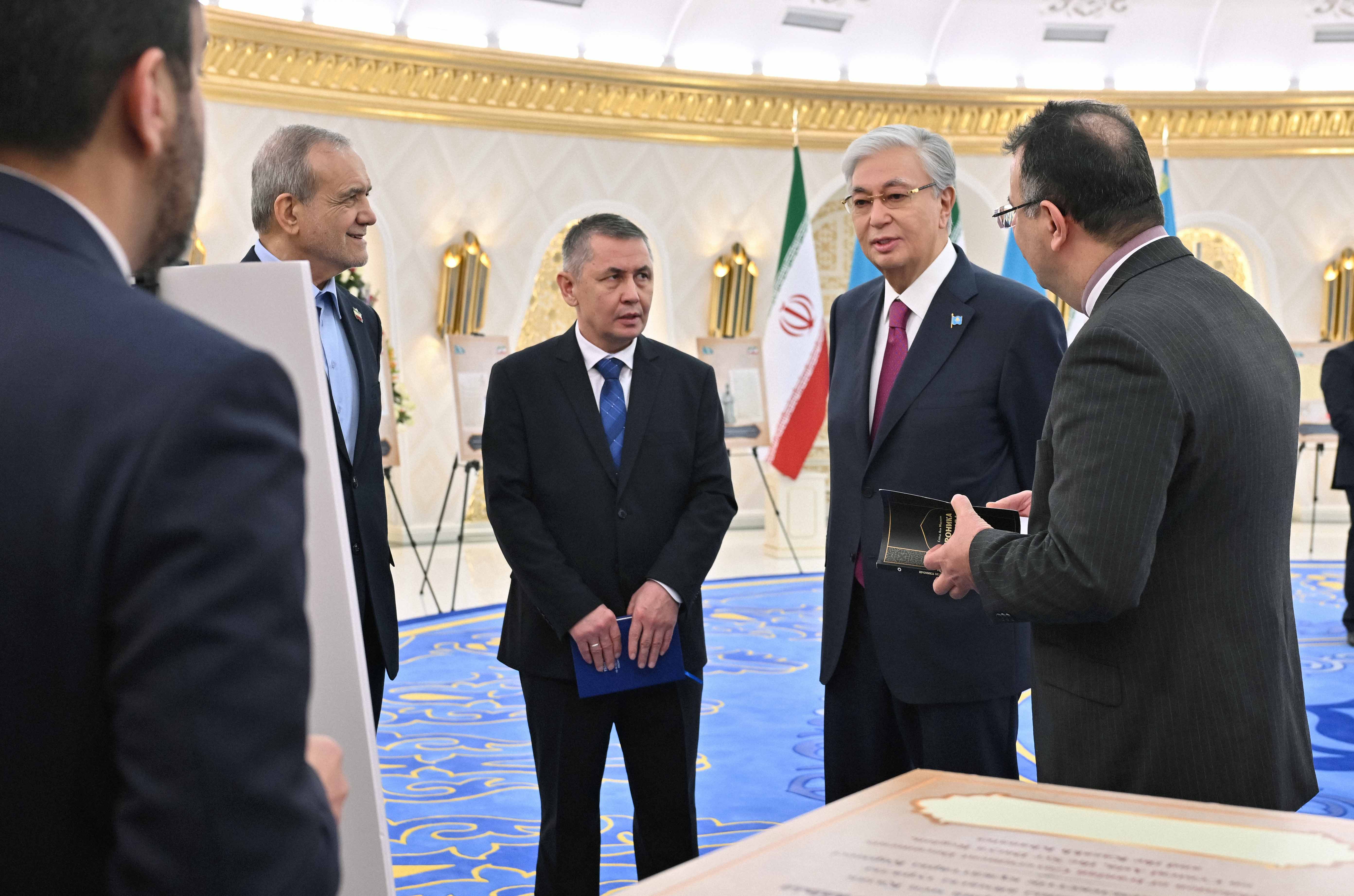 Қасым-Жомарт Тоқаев пен Масуд Пезешкианның назарына Иран Ислам Республикасы Сыртқы істер министрлігінің мұрағатынан алынған 27 қолжазбаның көшірмесі ұсынылды. XVIII-XIX ғасырларда қазақ даласында болған қоғамдық-саяси оқиғаларға қатысты құнды деректерді қамтитын жәдігерлер алғаш рет көрсетіліп отыр. Бұл құжаттар Қазақстан мен Иранның терең тарихи байланысын дәлелдей түседі. Мемлекет басшысы қазақ тарихына қатысты деректермен бөліскені үшін Масуд Пезешкианға алғыс айтты. – Бұл – өте құнды сыйлық. Біз міндетті түрде қазақ қауымына бұл көрмені көрсетеміз, бұқаралық ақпарат құралдары арқылы кеңінен дәріптейміз. Бұрын білмеген тарихи деректер бар екен. Қазақ халқына пайдалы болады деп ойлаймын, – деді Қасым-Жомарт Тоқаев.